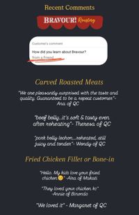 "That was a good meal! My Family thanked me for my choice for dinner. Loved the crunch of the chicken. It was delightfully juicy and delicious...." "...passed the discriminating taste buds of my son." "My BOSS SON liked it." "My picky daughter said 'totoo ang tsismis...Masarap nga'" "Bravour tastes so yummy, it's 1 billion out of 10." see Instagram Stories / Posts for more customer reviews (link below)